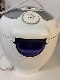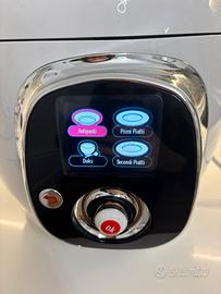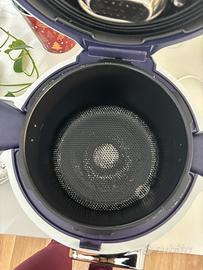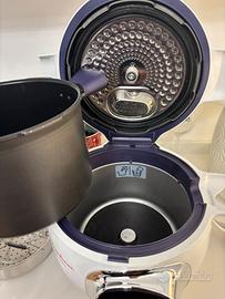 Pentola a pressione, vaporiera e pentola Moulinex, provvista di ricettario, uso libero e indicazioni in base agli ingredienti. Dotata di cavo, ricettario, libretto istruzioni e libretto garanzia. All’interno contiene la pentola e il cestello. Svolge le funzioni di una normale pentola/padella e di vaporiera. Unici difetti base pentola un po’ rovinata come da foto.