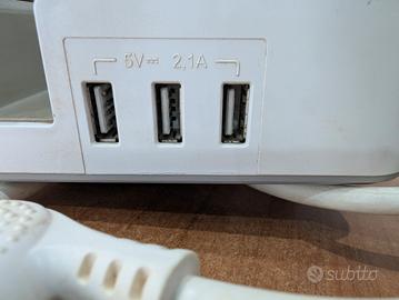vendo multipresa perfettamente funzionante con 2 prese shuko e 3 ingressi per ricarica USB , cavo lungo circa 2 metri , spina salva spazio e comodo scomparto per appoggiare lo smartphone durante la ricarica.