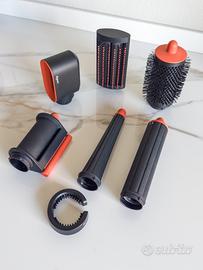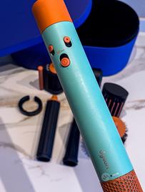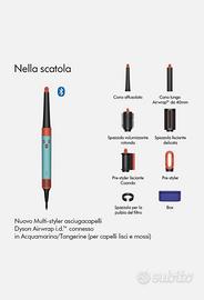 Dyson Airwrap i.d. – Styler Multifunzione con Tecnologia Intelligente Acquamarina/Tangerine — ancora in garanzia (11/2026) Tecnologia Airwrap™, versatilità 6 in 1. Asciuga, arriccia, modella, allunga, liscia e diffonde. L'unico multi-styler connesso in grado di adattare in modo intelligente calore, flusso d'aria e tempi al tuo tipo di capelli. Tecnologia wireless Bluetooth® per connettersi all'app MyDyson™. Qui puoi creare un profilo capelli in modo rapido e semplice, rispondendo a sei domande sul tuo tipo di capelli e sulla loro lunghezza. Per una sequenza di styling automatizzata, su misura per te. Include il cono affusolato: modella più vicino alla radice, per ricci più stretti mantenendo volume ed elasticità. Specifiche tecniche: Motore digitale Dyson ad alta velocità (fino a ~110.000 giri/min) Tecnologia Coanda per attrarre e avvolgere automaticamente i capelli Controllo intelligente del calore (misurazione fino a 40 volte al secondo) 3 livelli di temperatura 3 velocità di flusso d’aria Colpo d’aria fredda per fissare lo styling Potenza: 1.300 W Alimentazione: 220–240V Cavo professionale con base rotante Incluso: Corpo motore Dyson Airwrap i.d. Accessori per styling (come da foto) Custodia rigida originale Dyson Condizioni: in ottimo stato, ancora in garanzia (11/2026), perfettamente funzionante.