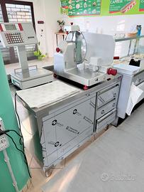 n.2 banchi frigo, banchi acciaio inox, cassa, affettatrice, ecc.