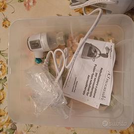 nebulizzatore a pistone Prestoneb, un dispositivo medico utilizzato per l'aerosolterapia. Converte i farmaci liquidi in piccole particelle di vapore che possono essere inalate nelle vie respiratorie.