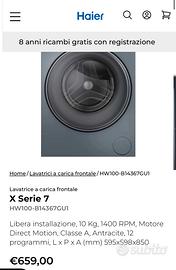 Vendo per non utilizzo , ancora imballata mai usata , lavatrice haier X Serie 7 modello HW100-B14367GU1 Libera installazione, 10 Kg, 1400 giri di centrifuga , Motore inverter Direct Motion, Classe A-30%, Antracite, 12 programmi, L x P x A (mm) 595x598x850 no scambi , no perditempo Ritiro Zona palermo e provincia no spedizione