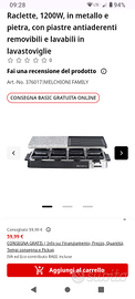 come da descrizione su internet: "La versatilità che trasforma ogni pasto in una festa! Scopri la Piastra Liscia e Grill con Raclette , l'alleato perfetto per le tue serate in compagnia. Con il suo design funzionale e le numerose caratteristiche, rende ogni pasto un'esperienza indimenticabile.Set Piastra Liscia e Pietra con Raclette: Offre una superficie versatile per grigliare e cucinare diversi alimenti contemporaneamente.Termostato Regolabile: Permette di controllare la temperatura per una cottura perfetta.