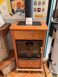 NUOVA STUFA IN MAIOLICA LAVORATA CON UN PREZIOSO MOTIVO AD INTRECCIO FOCOLARE INTERAMENTE IN GHISA DELLO SPESSORE 7mm POTINA CON VETRO CERAMICO, CASSETTO PORTACENERE CASSETTONE PORTA LEGNA ESTRAIBILE.