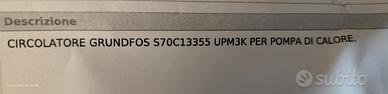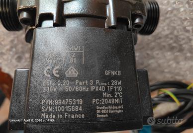 Vendo pompa di circolazione (Water Pump) originale Mitsubishi Electric, codice ricambio S70C13355, prodotta da Grundfos (modello GFNKB / 99475319). Il prodotto è NUOVO, mai installato, ancora nella sua confezione originale come visibile in foto. Caratteristiche tecniche: Codice Mitsubishi: S70C13355 Codice Grundfos: 99475319 Compatibilità: Specifica per sistemi a pompa di calore Mitsubishi Ecodan (serie EHPT, ERSD e simili). Specifiche elettriche: 230V - 50/60Hz - Max 60W. Ottima occasione per chi deve riparare la propria unità interna Mitsubishi Ecodan risparmiando sensibilmente rispetto al prezzo di listino del centro assistenza.