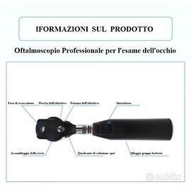 Oftalmoscopio Professionale Standard di sicurezza: GB/T 32610 Dimensioni della scatola esterna: 10,0 cm * 21,0 cm * 27,0 cm Utilizzo: controllo Fondo oculare Anteriore Posteriore Classificazione dell'attrezzo: Classe I Alimentazione a con 2 batteria tipo Mezza Torcia da 1,5V non inculsinelle confezione