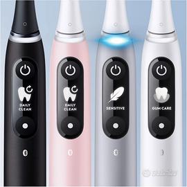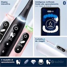 Oral-B Spazzolino Elettrico Ricaricabile iO6 Nero Con Custodia Da Viaggio, 1 Spazzolino + 1 Dentifricio Gengive & Smalto Repair, Classico-Menta 75ml LA RIVOLUZIONARIA TECNOLOGIA MAGNETICA iO per la migliore pulizia di Oral-B di sempre, per una sensazione di pulito purificante professionale e un'incredibile esperienza di spazzolamento delicato Combina l’ESCLUSIVA TESTINA ROTONDA dello spazzolino Oral-B con DELICATE MICRO-VIBRAZIONI, per una sensazione di freschezza e pulizia in bocca. Gengive più sane al 100% in una settimana rispetto ad uno spazzolino manuale tradizionale IL DISPLAY INTERATTIVO segnala le informazioni principali, comprese le modalità di spazzolamento e il promemoria per la sostituzione, ti saluta quando lo accendi e ti sorride quando fai un buon lavoro L'INTELLIGENZA ARTIFICIALE riconosce il tuo stile di spazzolamento e ti guida per pulire tutti i denti e non tralasciare le zone difficili da raggiungere 5 MODALITÀ DI PULIZIA INTELLIGENTI per personalizzare il tuo spazzolamento: Pulizia Quotidiana, Denti Sensibili, Protezione Gengive, Pulizia Profonda, Sbiancante IL SENSORE DI PRESSIONE INTELLIGENTE migliorato ti avvisa con una spia rossa, bianca o verde se stai spazzolando troppo forte, troppo delicatamente o con la giusta pressione Contenuto: 1 spazzolino iO6 con 2 testine pulenti di ultima generazione, 1 custodia da viaggio, 1 caricatore, 1 dentifricio Gengive & Smalto Repair
