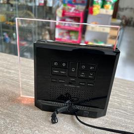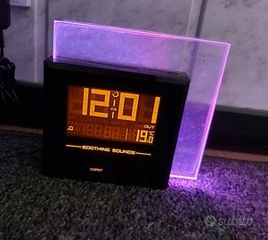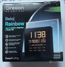 OREGON SCIENTIFIC RM902 RAINBOW CLOCK SVEGLIA con Orologio Radiocontrollato e RadioSveglia, senza il sensore esterno. La RadioSveglia RRM902 è nuova e mai usata, è stata utilizzata solamente per esposizione in vetrina di negozio. Informo che presenta qualche piccolo segno sullo schermo anteriore, visibile solamente se si posiziona la sveglia in controluce. Viene venduta con la sua scatola originale e il suo alimentatore di corrente, ma senza il sensore di temperatura esterno. La RADIOSVEGLIA OREGON SCIENTIFIC RM902 ha un design davvero molto curato con un display davvero molto ampio e all’interno di esso raccoglie una serie di informazioni molto interessanti oltre al solito orario e alla frequenza delle stazioni musicali selezionate, può visualizzare anche la temperatura esterna (con utilizzo di Sensore Esterno non compreso nella confezione). La OREGON SCIENTIFIC RM902 ha la possibilità di produrre luce propria proprio grazie a quel quadrante trasparente che vedete all’interno della radiosveglia. Si può persino scegliere il colore e la luminosità in modo tale da non dare fastidio durante il sonno, davvero un’ottima idea che crea atmosfera anche prima di addormentarsi. La funzione del colore si chiama Lightshow e scorre cambiando tinta fino a quando non premete pausa per selezionare quello che più vi aggrada, ad ogni colore corrisponde un suono della natura che insieme si perpetuano in sincronia. - Orologio Sveglia Radiocontrollato, la tua stazione sveglia mostra sempre l'ora corretta con indicazione del giorno della settimana perchè ricevuti automaticamente tramite il segnale radio DCF. - Retroilluminazione del Display di colore ambra Tecnologia Touch Key (snooze/light). - 8 Soothing Sound rilassanti per facilitare il riposo e garantire un gradevole risveglio: 4 melodie della natura e 4 melodie rilassanti. - Effetti cromatici che cambiano intorno alla cornice trasparente, con 3 modalità di impostazione. - Radio FM con 8 stazioni memorizzabili.