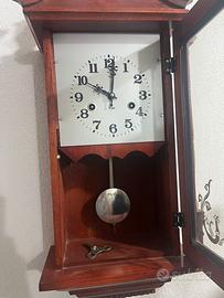 Orologio a pendolo da parete antico stile classico. Steutrura in legno lucidato con colonne decorative dorate e fregi ornamentali.