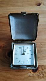 Vendo orologio meccanico da tavolo portatile d'epoca. Funzionante, non ha bisogno di pile. Manca una delle barrette di metallo per tenerlo nella sua sede, facilmente riparabile. Consegna a mano in zona Milano Comasina o metro Zara.