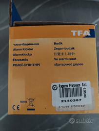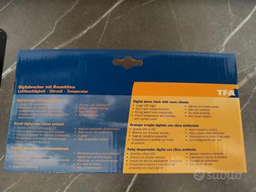 vendo sveglia digitale con grandi cifre a led, allarme con funzione di snooze, segnale acustico crescente, temperatura e umidità con livello di confort, valori massimi e minimi, data e giorno della settimana, sistemazione su piano d'appoggio, completa di batterie e cavo di alimentazione.