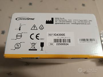 OSTEOSPINE è uno stimolatore elettrico dell’osteogenesi che utilizza campi elettrici. OSTEOSPINE è un dispositivo medico che utilizza un segnale alternato alla frequenza di circa 60 KHz per pilotare una coppia di elettrodi di dimensioni specificate così da produrre sulla sede da trattare la circolazione di una corrente di bassa intensità (circa 1mA) e con una densità media compresa nel campo dai 15 ai 30 µA/cm2. Usato solamente per un mese. Completo di 38 elettrodi. Prezzo di acquisto 1450 €