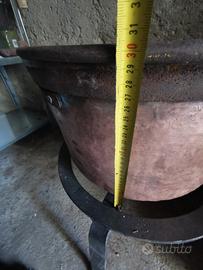 Paiolo grande in rame antico con supporto ferro