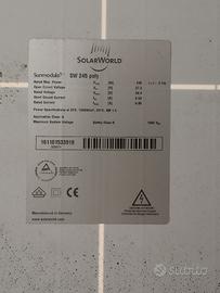 Vendo 12 pannelli fotovoltaici SolarWorld da 245 w ciascuno, per un totale di 3 kw circa, con inverter SUNNY BOY da 3 kw, usati 12 anni e ancora in ottime condizioni. Metto in vendita esclusivamente per aumento kw impianto, con nuovi pannelli e inverter adeguato, della propria abitazione.