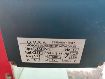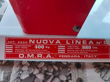 Passapomodoro elettrica professionale, marchio O.M.R.A. Ferrara Italy: . 400 kg/h . Alimentazione 230 V . Potenza 0.3 KW