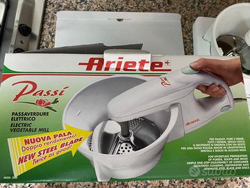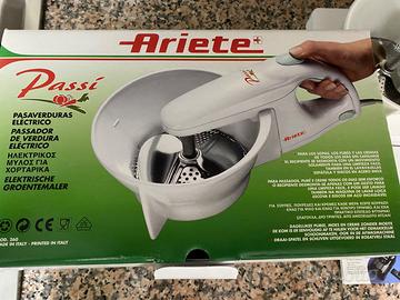 OCCASIONE! Vendo passaverdure elettrico Passí Ariete, di color bianco. Mod. 260 - Made in Italy Nuovo mai usato (ancora imballato con la confezione originale, incluso di libretto di istruzioni). Non faccio spedizioni ma solo consegna a mano. No perditempo! Per passati, puré e creme, tutti i giorni, senza fatica. Il recipiente si smonta con un gesto per una facile pulizia e anche in lavastoviglie. Spatola e dischi in acciaio inox. Doppio senso di rotazione a velocità ideale e costante. Spatola e 3 dischi intercambiabili di differente foratura in acciaio inox e comoda palettina. Larga base di appoggio: si adatta stabilmente a qualsiasi recipiente. É leggero, resistente agli urti e al calore e di ingombro ridotto. Facile da usare, basta inserire la spina e premere il pulsante.