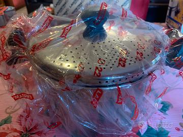 speciali nanici atermici che consentono di bloccare coperchio e di scolare con facilità. i fori su ina parte del coperchio permettono di scolare guadagnando tempo , un grande aiuto in cucina