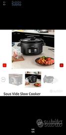 1)Inserire il cestello per la cottura Sotto Vuoto all'interno della pentola di ceramica.2)aggungere acqua calda e riempire a metà la pentola in ceramica.3)Premere la funzione Sotto Vuoto e impostare la temperatura desiderata.4)Inserire il cibo in sacchetti con chiusura a zip e immergerli delicatamente all'interno del cestello nella penola in ceramica, sigillare il sacchetto.5)Posizionare il coperchio sulla pentola e inserire la sonda della temperatura nell' acqua e preme START