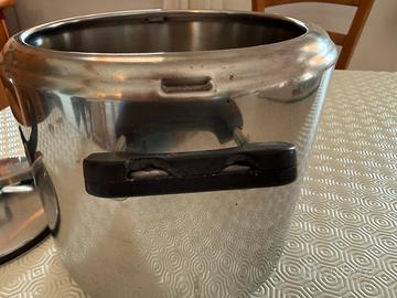 Pentola a pressione Aeternum anni ‘70 funzionante. Come si vede dalla foto la valvola della pressione manca e uno dei due manici presenta segni di usura .