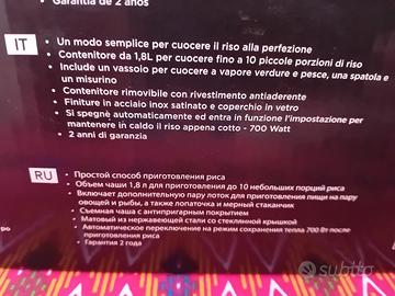 Cuoci riso e vaporiera Russell Hobbs prodotto nuovo,errato acquisto, contenitore antiaderente da 1,8 lt,10 porzioni,finiture inox,spegnimento automatico e mantenimento in caldo.