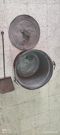 vendo pentola antica vintage con coperchio in rame e paletta in ferro