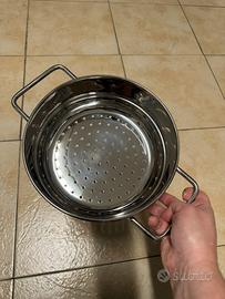 Pentola alta per spaghetti e vaporiera in acciao inox, il coperchio in vetro con buchi per scolare l’acqua. Sono 4 pezzi, include una pinza.