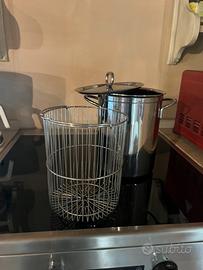 Pentola in acciaio inox con cestello per cottura asparagi, usata pochissime volte, in ottime condizioni. Altezza cm 22 , diametro cm 18