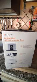 Pentola per cottura lenta Enkho mai usata. Pentola per cottura lenta con corpo in acciaio inox satinato e pentola interna in ceramica removibile. Ha un coperchio in vetro per controllare a vista la cottura e una capacità di 3,5 litri. La pentola interna e il coperchio sono lavabili in lavastoviglie. Potenza 200 W.