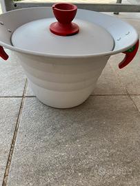 Gli anelli sui fianchi indicano il livello dell'acqua per il numero dei commensali mentre al centro del coperchio esiste un misurino per la quantità di sale. Vintage Da collezione