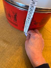 Prodotta in Italia negli anni 70 La pentola è stata realizzata in metallo e ricoperta con uno strato di smalto, mentre la bordatura e i manici sono cromati. I manici possono essere tolti per rendere la pentola più pratica da mettere in forno.