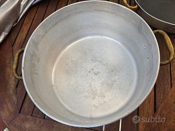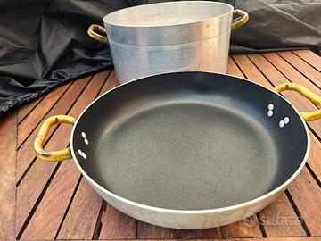Una casseruola Pentole Agnelli (35×18 cm), un tegame antiaderente (37 cm) Entrambe in alluminio pesante, manici ottone. Piccoli Segni come da foto.