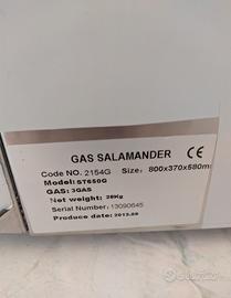 vendo per mancato utilizzo nuovo forno Salamandra a gas professionale ancora nella sua imballaggio originale mai usato , il forno con 3 lati chiusi GN 1/1 , esecuzione in acciaio inox , salamandra chiusa su tre lati , griglia in acciaio cromato con impugnatura atermiche , posizionabile su 4 livelli , bruciatore diamantato su tutta la lunghezza del cielino , accensione elettrico con accenditore a batteria , cassetto estraibile per la raccolta residui di cottura , adatto per bacinelle e teglie gastronomici