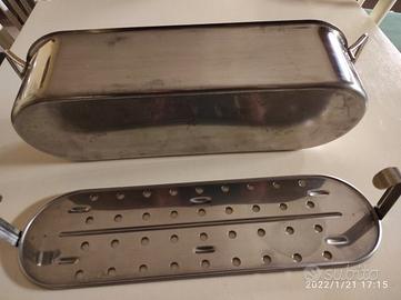 Pentola o casseruola Ideale per cuocere il pesce sia bollito che al vapore, o qualsiasi cosa possa essere bollita come anche il cotechino. con griglia coperchio e manici in acciaio inox, diametro cm 47 , con manici cm 52, H cm 10, profondita' cm 16, tipologia cottura gas, usata solo 2 volte, come nuova.