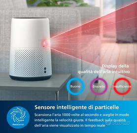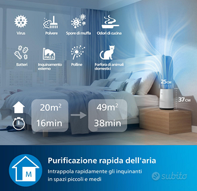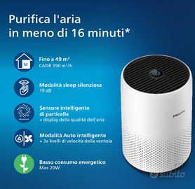 Pari al nuovo, comprato e utilizzato due volte, perfettamente funzionante. Informazioni su questo articolo GRANDE COPERTURA FINO A 49 m²: con un tasso CADR di 190 m³/h, può purificare 20 m2 in meno di 16 minuti (1) FILTRAZIONE HEPA A 2 STRATI: cattura il 99,5% delle particelle di dimensioni fino a 0,003 micron (2) - per proteggere da pollini, polvere, acari della polvere, forfora di animali domestici o smog CERTIFICATO ALLERGY-FRIENDLY da ECARF: il purificatore rimuove il 99,99% degli allergeni da polline, acari della polvere o da peli di animali domestici (5) SILENZIOSO ED EFFICIENTE: In modalità sleep, funziona a soli 19 dB (3); efficiente dal punto di vista energetico, utilizza fino a 20 W per purificare l'aria, meno di una lampadina tradizionale SCANSIONE E VISUALIZZAZIONE: il sensore di particelle esegue la scansione degli agenti inquinanti presenti nell'aria e seleziona automaticamente la giusta modalità; visualizza la qualità dell'aria in tempo reale, tramite un'intuitiva ghiera colorata TESTATI PER LA QUALITÀ: Philips vanta oltre 80 anni di esperienza nella cura dell'aria. I nostri purificatori sono sottoposti a 170 test rigorosi prima di essere immessi sul mercato, per garantirne la massima qualità. FILTRO A LUNGA DURATA CON INDICATORE DI CAMBIO SMART: il filtro dura fino a 1 anno (4), per cui è possibile risparmiare a lungo termine rispetto ad altri purificatori d'aria. Si consiglia di utilizzare i filtri di ricambio originali Philips per ottenere le migliori prestazioni dal purificatore - compatibili con FY0194 (HEPA) o FY0293 (HEPA + Carboni attivi). Il filtro di ricambio compatibile per questo dispositivo è il FY0900, il nostro filtro più compatto e sostenibile fino ad oggi (6). Questo nuovo filtro sostituisce il precedente FY0914 e offre prestazioni ancora migliori.