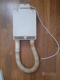 Asciugacapelli da parete, 900W. Modello Elite Basic, design italiano registrato e brevettato. Adatto per hotel e B&B ma anche praticissimo a casa per tutto ciò che ha bisogno di una asciugatura veloce perchè sempre a portata di mano. Estremamente sicuro anche per i bambini perché l'elemento elettrico riscaldante è sempre fissato al muro e la mano tiene solo il tubo col diffusore di aria calda. Si collega direttamente alla corrente e si accende e spegne in automatico staccando o appendendo il diffusore al suo magnete. Completo di scatola originale e staffa di aggancio supplementare, presenta ingiallimenti tipici della plastica esposta alla luce.