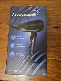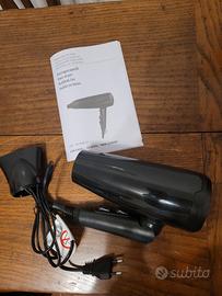 Phon di colore nero con manico pieghevole. 3 livelli di temperatura, 2 velocità, colpo d'aria fredda. Potenza 1800 -2000 W.