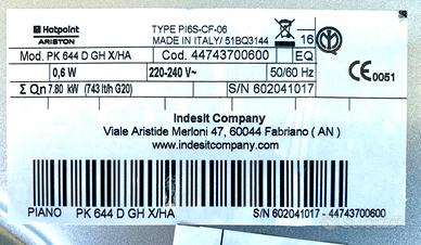 Hotpoint PK 644 D GH X /HA Piano cottura in Acciaio inossidabile, da incasso, Tipo di gas: Metano. Larghezza: 600 mm, Profondità: 520 mm, Altezza : 40 mm Piano cottura di 3 anni , cambiato con piano ad induzione elettrico.