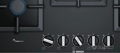 il piano cottura è dotato di bruciatori in ghisa nera smaltata, il sistema di regolazione del gas denominato Bosch Flame Select consente di regolare su 9 livelli progressivi con Pomelli in acciaio inox.