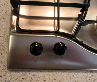 Piano cottura a gas in acciaio inossidabile, marca Ariston. Dispone di quattro fuochi e griglie robuste. - Materiale: Acciaio inossidabile - Marca: Ariston - Numero di fuochi: 4 - Griglie nere in ghisa - Tipo cottura : Gas - Manopole frontale superiore - Con coperchio vetro nero trasparente Dim : larg.600mm prof 510mm alt.39 mm