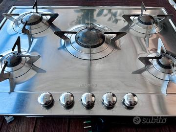 Vendo piano cottura a gas Smeg P705ES, in acciaio inox, 5 fuochi (bruciatore centrale ad alta potenza), manopole frontali e griglie in acciaio inox.