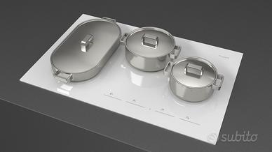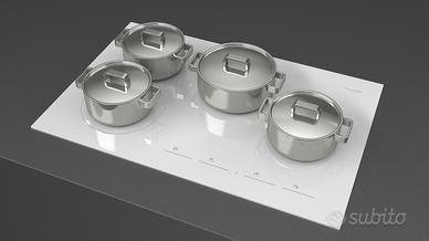 Il piano cottura a induzione consente presenta 4 zone di cottura e la combinazione verticale per tegami di dimensioni maggiori (vedere fotografie; N.B.: le fotografie che raffigurano la disposizione delle pentole sul piano hanno il solo scopo di illustrarne le possibilità, per il prodotto oggetto dell'annuncio si prega di fare riferimento alle fotografie del medesimo già installato).