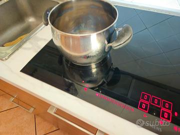 Piano cottura ad induzione di qualità superiore, marca Siemens, 5 fuochi con una zona flex utilizzabile per bistecchiera o separabile in 2/4 zone distinte. Presenta una scheggiatura nel lato destro che non ne compromette il funzionamento.