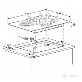 5 zone cottura, 75 cm x 52,4 cm