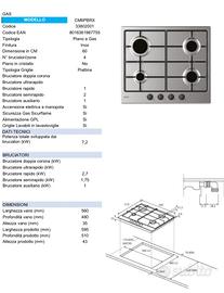 Piano cottura a gas in acciaio inox con 4 bruciatori di cui 1 rapido (2,7 kW), 2 bruciatori semirapidi (1,75 kW ciascuno), 1 bruciatore ausiliario; griglie lavabili in lavastoviglie, alimentazione GPL, accensione elettronica a manopola, valvola di sicurezza Sicur Flame (interrompe il gas in caso di spegnimento accidentale della fiamma), potenza dei bruciatori: 7,2 kW. Il montaggio degli elettrodomestici non è previsto senza l'acquisto di una cucina.