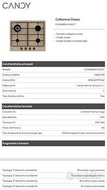 Vendo a causa errore acquisto Piano cottura a gas Candy serie Classic colore Avena modello CHW6BRAV4WGT misure (mm): 38x595X510 Dimensioni del vano per l'installazione (mm) 480X560 Griglie lavabili in lavastoviglie
