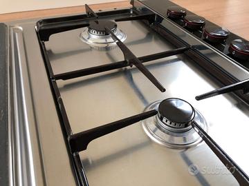 Piano di cottura a 4 fuochi e piastra elettrica marca Rex mai usato, con piatto in acciaio inox e griglie smaltate. Il piano ha l'accensione elettronica ma non la valvola di sicurezza. Prezzo escluso di trasporto. Le misure di incasso sono cm. 84 x 48 di profondità.