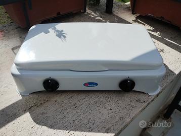 Piano cottura a gas metano della Parker con 2 fuochi, spartifiamma in ottone e griglia in acciaio cromato. Utilizzo interno / esterno. Made in Italy.