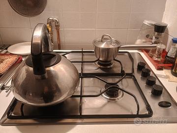 piano cottura a gas in acciaio con 2 griglie orizzontali. in buono stato, con 4 bruciatori in ottimo stato più 4 nuovi , istruzioni uso e montaggio in italiano. alcune macchie sull'acciaio visibili nella foto.