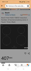 Nuovo ancora imballato Bosch Piano cottura a induzione PUE611BB5D in vetroceramica nero da 60 cm - Serie 4 Cod. PUE611BB5D Cod. EAN 4242005286089 Materiale: • Vetroceramica Caratteristiche principali: • 4 zone di cottura con riconoscimento automatico della pentola • Senza cornice • Funzione PowerBoost per ogni zona di cottura Sistema di controllo: • Comandi frontali touchControl • Display elettronico • Regolazione elettronica a 17 livelli • Count-down timer: timer di fine cottura per ogni singola zona • Funzione QuickStart: consente una rapida selezione della potenza di cottura • Funzione reStart: ripristino impostazioni di cottura in caso di spegnimento accidentale Altre caratteristiche: • Autospegnimento di sicurezza • Sicurezza bambini • Funzione "Energy Tutor" per limitare l'assorbimento elettrico da 1 kW • Indicatore digitale di calore residuo