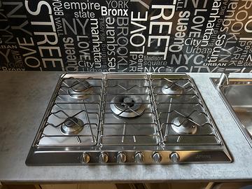 Piano cottura a gas Smeg 5 fuochi in acciaio inox, completo di griglie e manopole originali.